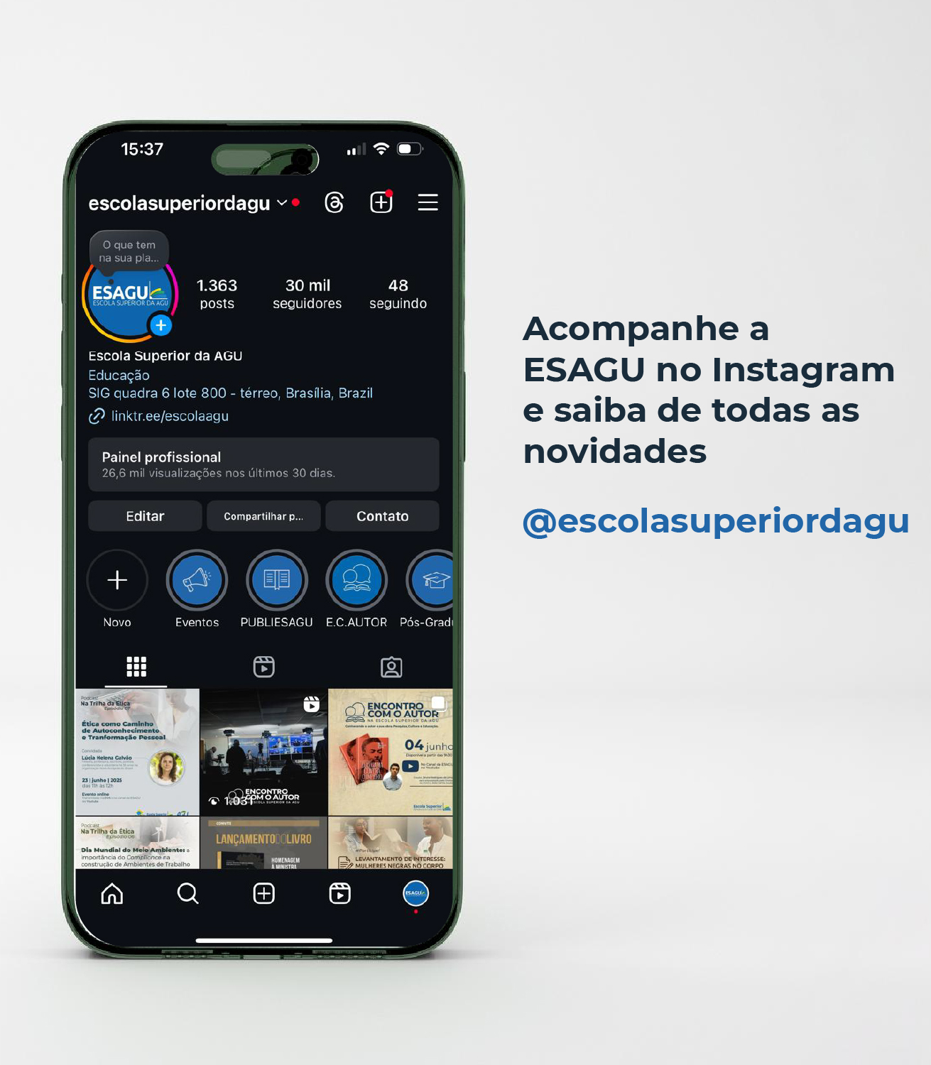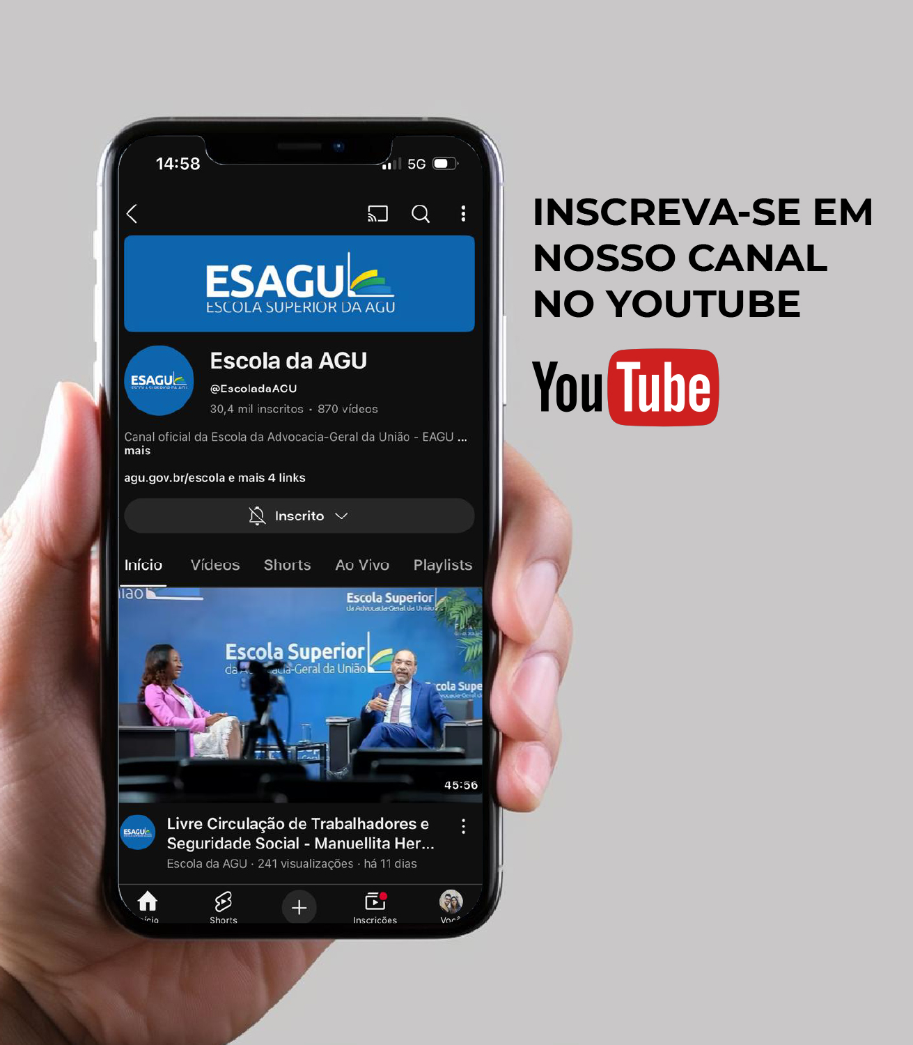 Confira o canal da Escola Superior da AGU no YouTube! Lá, você pode acompanhar eventos ao vivo ou acessar gravações de palestras e debates abertos ao público.